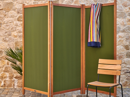 Unsere Paravents schenken Privatsphäre, wo die Nachbarterrasse auf Sichtkontakt ist. Gefertigt werden sie aus einem massiven Teakholzrahmen, den wir mit unserem wetterfesten Acryltuch-Gewebe bespannen. Die Grundeinheit besteht aus zwei Elementen, sie ist beliebig erweiterbar. Die Füße des Paravents bestehen aus pulverbeschichtetem, massivem Stahl. Das macht ihn richtig standfest. Und wenn Sie wollen, dass Ihr Paravent zum dekorativen Blickfang wird, dann wählen sie aus über vierzig Farbvarianten die passende