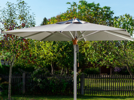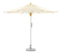 Mast und Streben werden aus hochwertigem Aluminium hergestellt und hellgrau eloxiert, die Schirmnaben fertigen wir aus verleimten Harthölzern. Diese Kombination macht den ALUSCHIRM unschlagbar stabil und witterungsbeständig. Wir liefern ihn mit Lufthaube und Flaschenzug. Wie bei unseren KLASSIKSCHIRMEN bieten wir ihn auch mit Volants an.