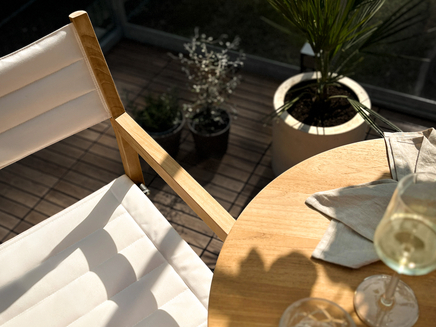 Unser LOFT Programm beeindruckt mit feinen Details. Beispielsweise einer Bank, deren spezielle Ergonomie für Sitzkomfort sorgt. Wir bieten sie in verschiedenen Längen zu den formschönen Tischen aus massivem Teakholz an. Der passende LOFT Sessel mit absolut wetterfesten, pulverbeschichteten Aluminiumdetails greift die klassische Form des klappbaren Regiestuhls auf. Selbstverständlich kann er mit jedem unserer vielseitigen Acryltuch-Stoffe bezogen werden.