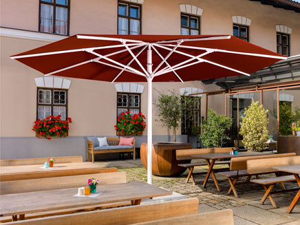 WIR HABEN IHN AUF DIE SPEZIELLEN BEDÜRFNISSE DER GASTRONOMIE ABGESTIMMT. OBWOHL UNSER TELESKOPSCHIRM RICHTIG GROSS IST, LÄSST ER SICH PROBLEMLOS SCHLIESSEN, OHNE DASS DIE TISCHE ODER BÄNKE DARUNTER STÖREN.